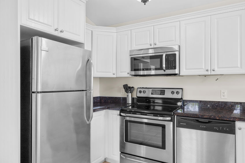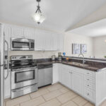 - Full kitchen with stainless steel fridge, stove, dishwasher, and microwave.